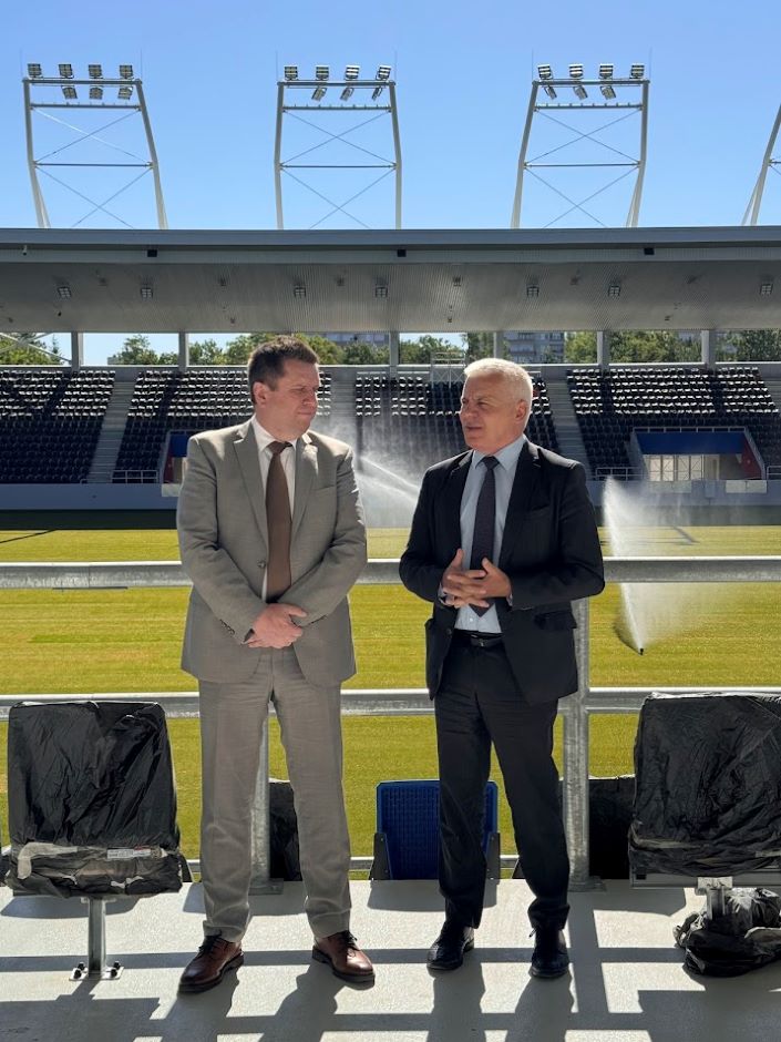 2024.05.14.-én dr. Kovács Ferenc Nyíregyháza polgármestere és Nyul Zoltán magasépítésért felelős helyettes államtitkár sajtóbejáráson mutatták be a Nyíregyházi Város Stadiont és Multifunkciós Sportközpontot.