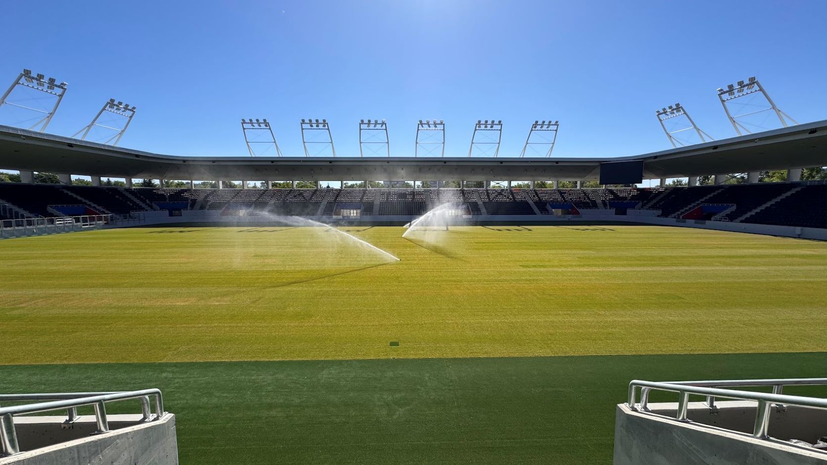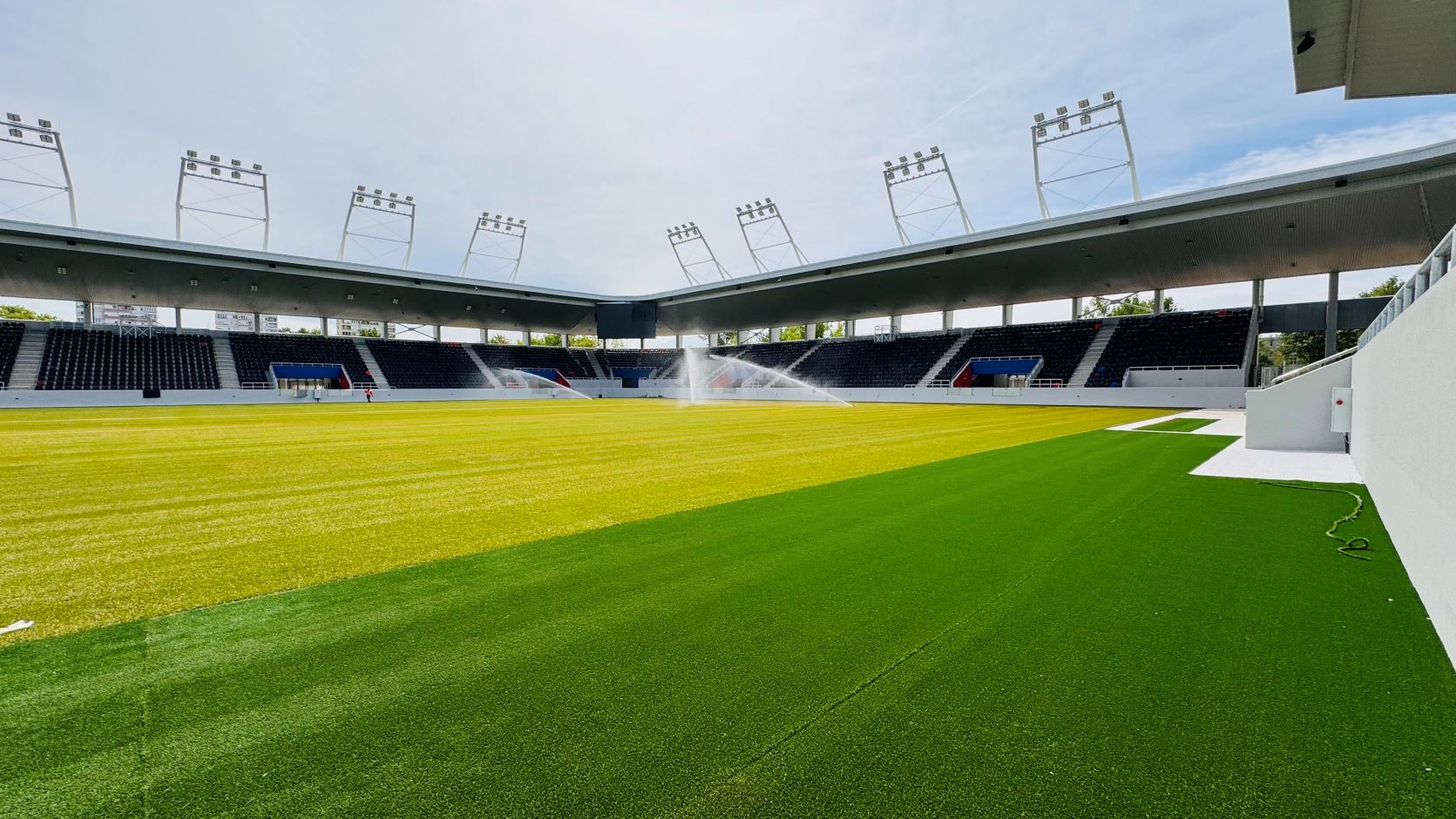 Folyamatosak a parkosítási munkálatok, amelyek mellett már a stadion gyepszőnyegét is terítik. Konzo...